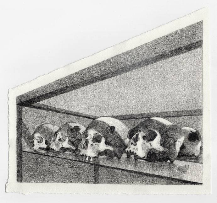 These graphite drawings are thoughtfully rendered observational studies of the International Museum of Surgical Science’s collection of human skulls. By studying the way light moves around an organic object and using tonality, mark-making, purposeful contrast, Gallo utilizes her skillset as a draftswoman to bring to life these people forgotten to time and highlight their unique cranial modification. The two ancient cranial modifications depicted in these anthropological illustrations are the practices of trephination and head flattening.